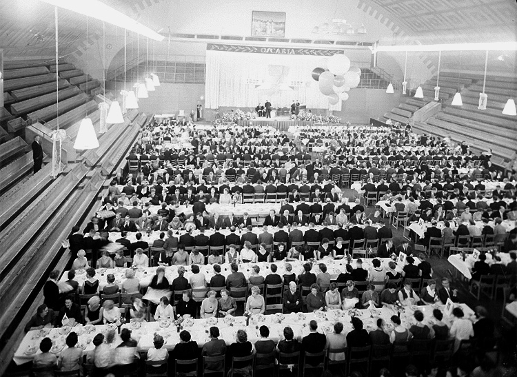Interiör, gruppbild. Oscaria jubiléet på Idrottshuset.