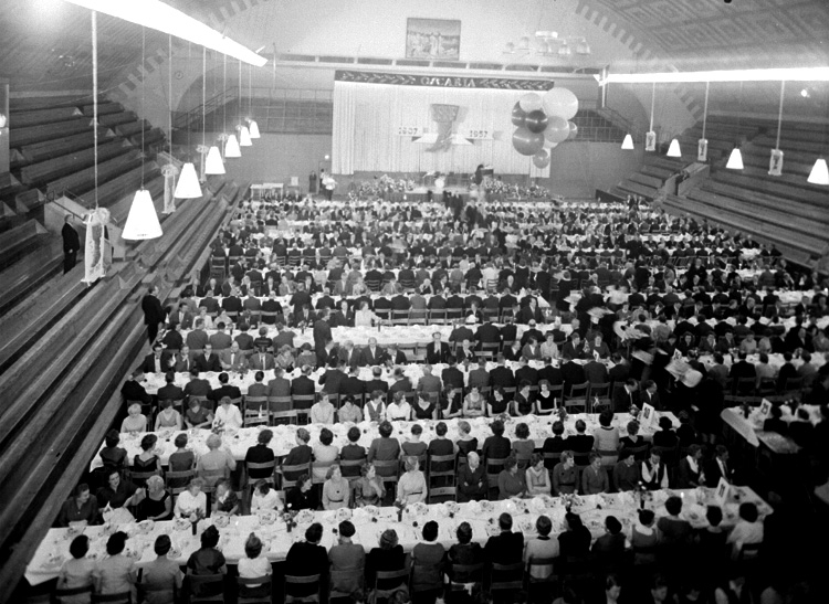Interiör, gruppbild. Oscaria jubiléet på Idrottshuset.