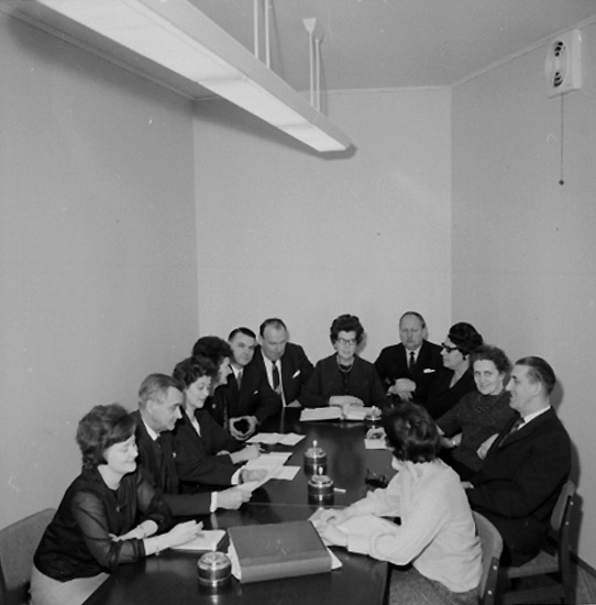 Rumsinteriör, grupp vid bordet. Styrelsen för Kexens Personalklubb.