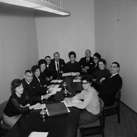 Rumsinteriör, grupp vid bordet. Styrelsen för Kexens Personalklubb.
