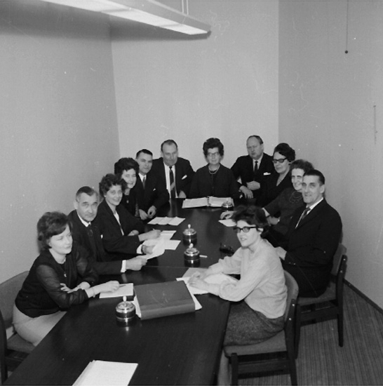 Rumsinteriör, grupp vid bordet. Styrelsen för Kexens Personalklubb.