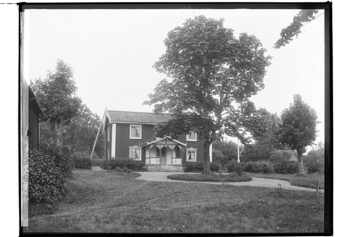 Tvåvånings bostadshus med veranda med snickarglädje