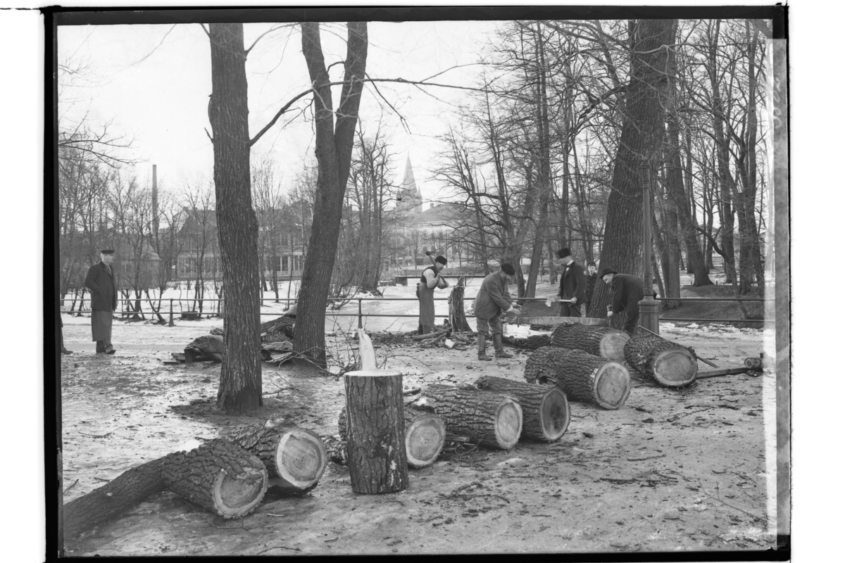 Slottsparken, kullblåst träd, 5 män sågar upp trädet.