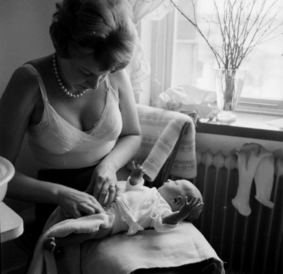 Rumsinteriör, en kvinna och en baby.