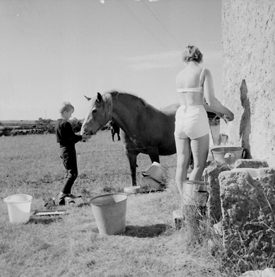 Familjeresan, en kvinna och en pojke, en häst.