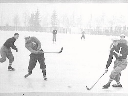 Bandymatch på Eyravallen. Jojje Gustafsson i kamp mot Viljan, målvakt.