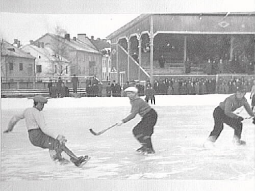 Bandymatch mellan Noraskog och ÖSK vid Eyravallen. Olle Sääv gör 1-0 på Noraskog.