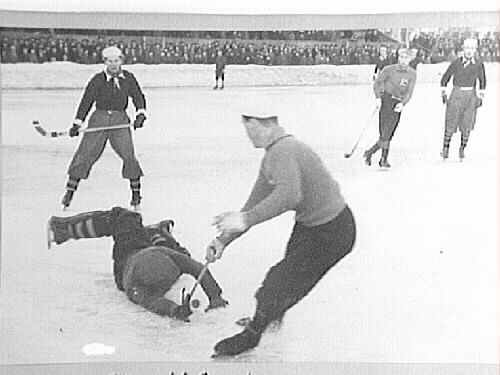 Bandy vid Eyravallen. Sten Karlsson ÖSK frestar Köpingsmålvakten.