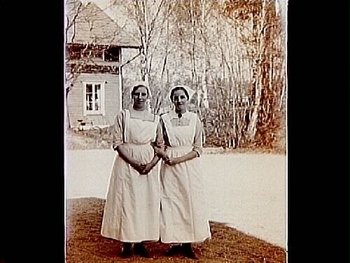 Kävesta Lanthushållsskola, två flickor med en skolbyggnad i bakgrunden.