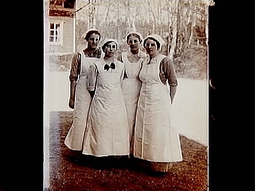 Kävesta Lanthushållsskola, fyra flickor med en skolbyggnad i bakgrunden.