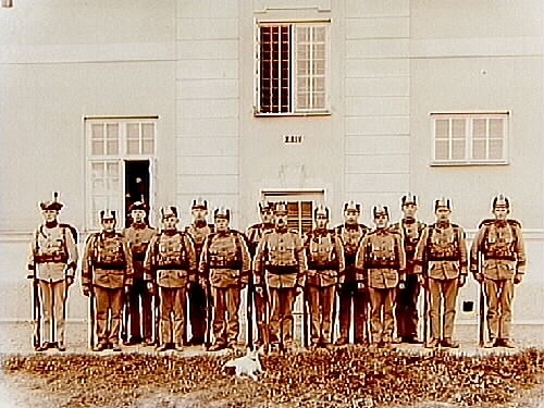 Soldatgrupp med full packning framför kasern, 14 soldater.