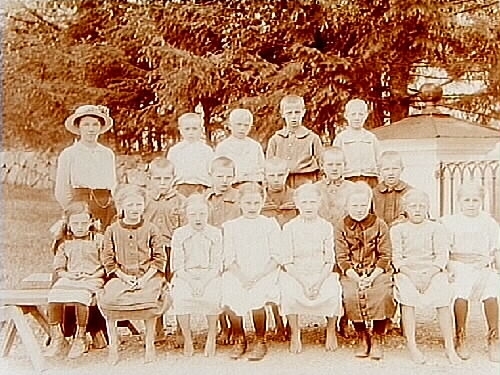 Lillkyrka skola, 17 skolbarn och lärarinnan fröken Frida Olsson.