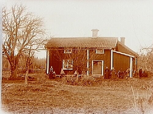 Byggnad, 6 personer framför byggnaden.