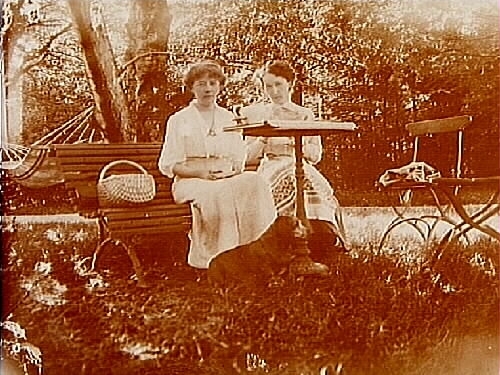 Två kvinnor på trädgårdssoffan.