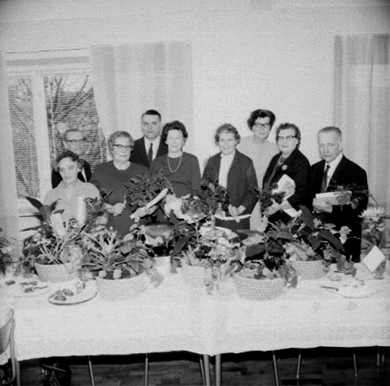 Rumsinteriör, grupp 9 personer, Kexens pensionärer. Personalklubben uppvaktar.