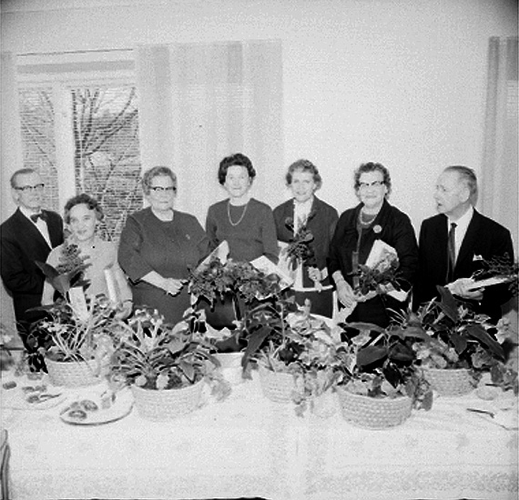 Rumsinteriör, grupp 7 personer, Kexens pensionärer. Personalklubben uppvaktar.
