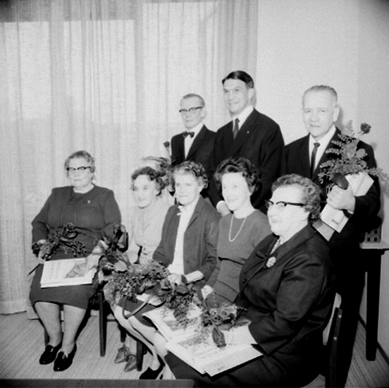 Rumsinteriör, grupp 8 personer, Kexens pensionärer. Personalklubben uppvaktar.