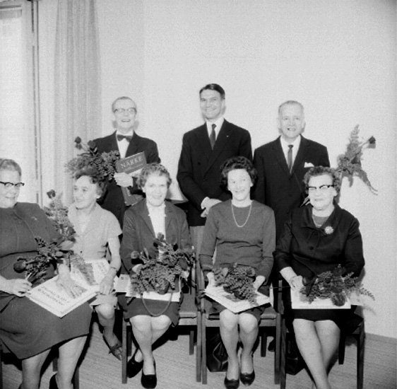Titel: Rumsinteriör, grupp 8 personer, Kexens pensionärer. Personalklubben uppvaktar. Örebro Kexfabrik.