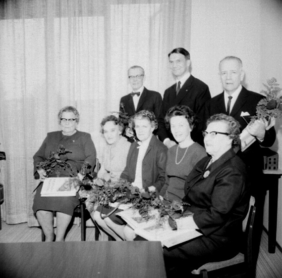 Rumsinteriör, grupp 8 personer, Kexens pensionärer. Personalklubben uppvaktar.
