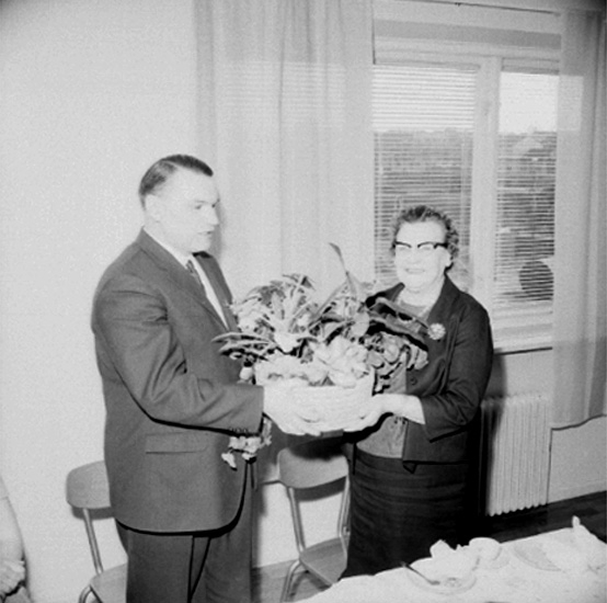 Rumsinteriör, 2 personer, Kexens pensionärer. Personalklubben uppvaktar.