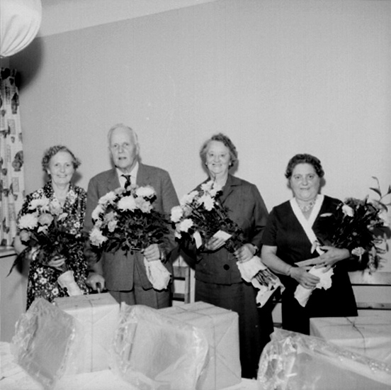 Rumsinteriör, fyra personer, Kexens pensionärer. Personalklubben uppvaktar.