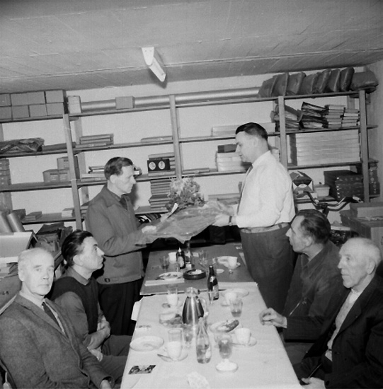 Rumsinteriör, grupp vid bordet, Kexens pensionärer. Personalklubben uppvaktar.