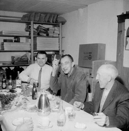Rumsinteriör, grupp vid bordet, Kexens pensionärer. Personalklubben uppvaktar.