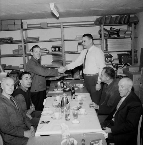 Rumsinteriör, grupp vid bordet, Kexens pensionärer. Personalklubben uppvaktar.