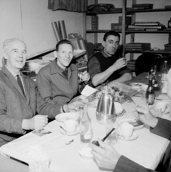 Rumsinteriör, grupp vid bordet, Kexens pensionärer. Personalklubben uppvaktar.