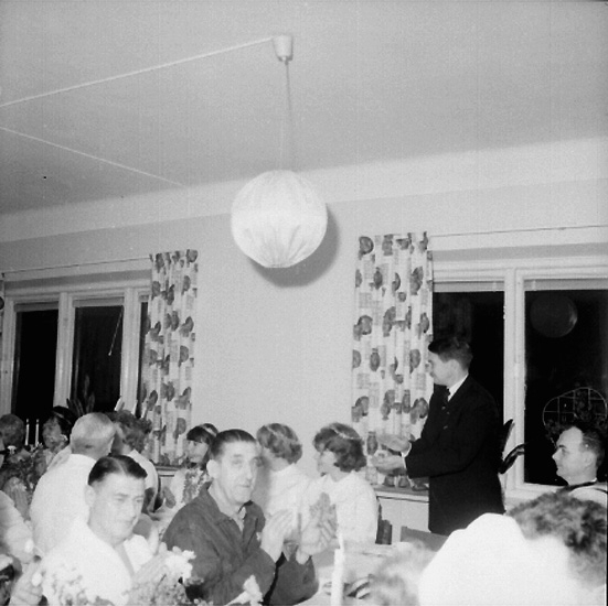 Titel: Rumsinteriör, grupp vid bordet, Luciafirande. Örebro Kexfabrik.