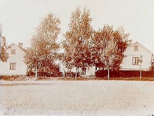 Tvåvånings enkelstuga, 2 st flygelbyggnader, 4 personer framför byggnaderna.