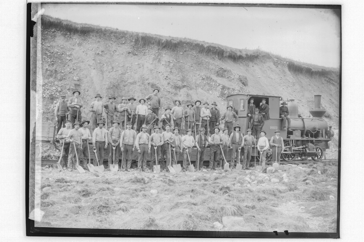 Förman Johansson med 35 rallare på ångloket Roxen med grusvagnar.
