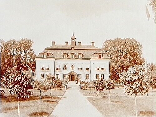 Esplunda slott, tvåvånings stenbyggnad med valmat tak, ett litet torn på taket.