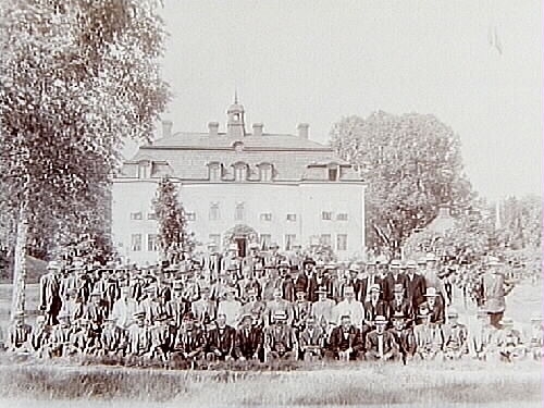 Titel: Esplunda slott, tvåvånings slottsbyggnad. Hushållningsgillets medlemmar.