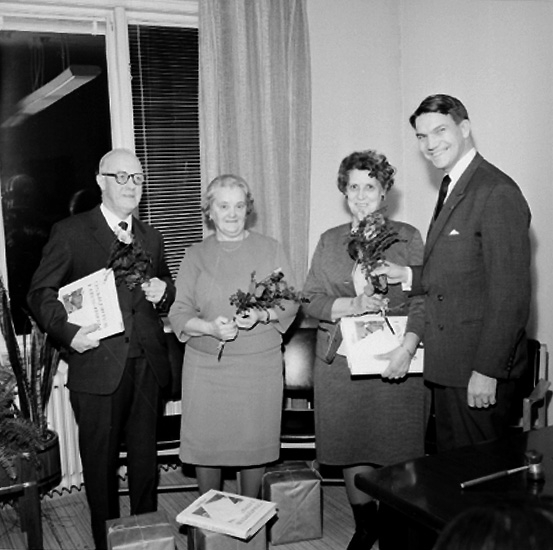 Titel: Rumsinteriör, Kexens pensionärer. Personalklubben uppvaktar. Örebro Kexfabrik.
