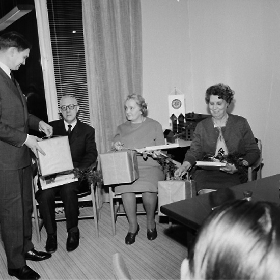 Titel: Rumsinteriör, Kexens pensionärer. Personalklubben uppvaktar. Örebro Kexfabrik.