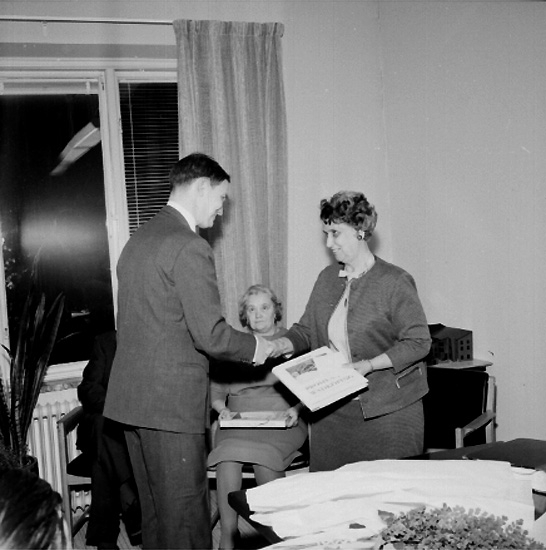 Titel: Rumsinteriör, Kexens pensionärer. Personalklubben uppvaktar. Örebro Kexfabrik.