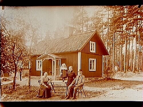 Sörby gård, envånings bostadshus, 4 personer framför byggnaden.