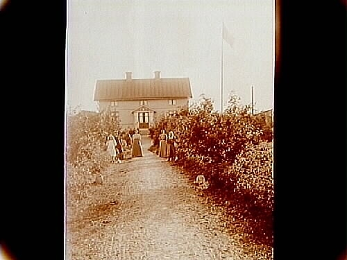 En och en halvplans bostadshus med veranda, 5 personer framför huset.