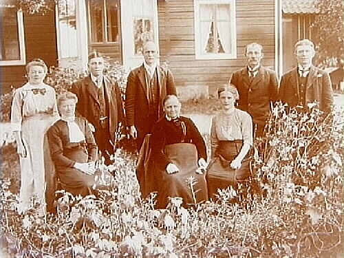 Bostadshus, 8 personer framför huset.