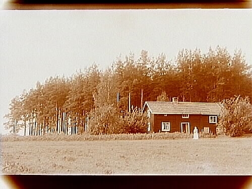 Titel: En och en halvvånings bostadshus, en kvinna framför huset. Maria Lithell