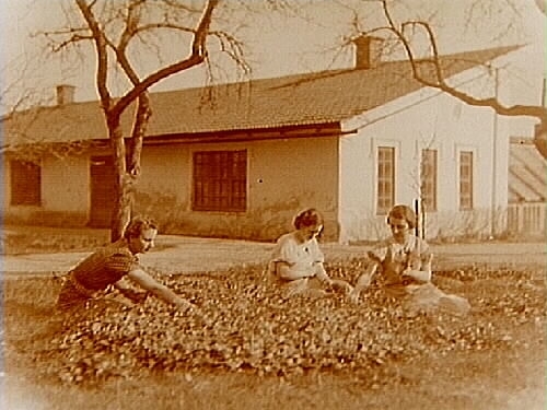 Tre flickor plockar blommor, bostadshus i bakgrunden.