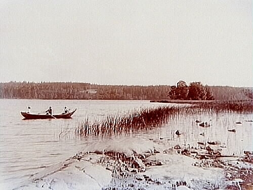 Titel: Roddbåt med tre personer i. Plats ej namngiven.