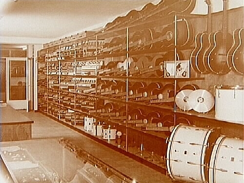 Skandia musik AB, affärsinteriör, musikinstrument.