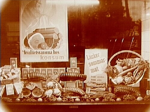 Konsum, skyltfönster, rökt skinka m m.