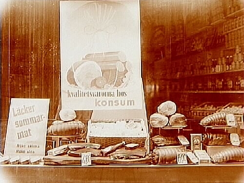 Konsum, skyltfönster, rökt skinka m m.