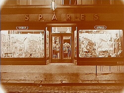 Spåres varuhus, två skyltfönster, leksaker, väskor m. m.