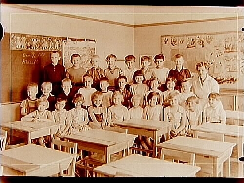 Klassrumsinteriör, skolbarn med lärarinna fru Sigrid Wiberg, sal 14 E.