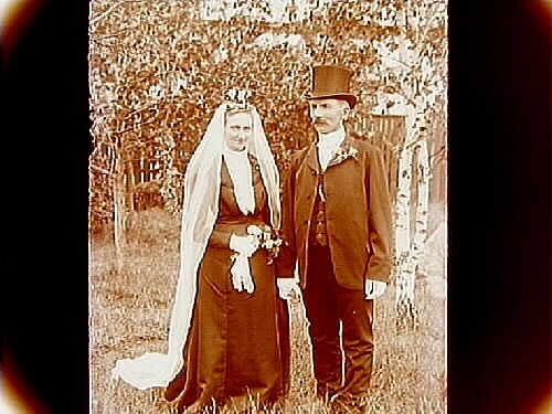 Brudpar, bruden i svart klänning med vit slöja, krona. Brudgummen i frack och hög hatt.