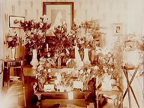 Rumsinteriör, silverbröllop, blommor i vaser.